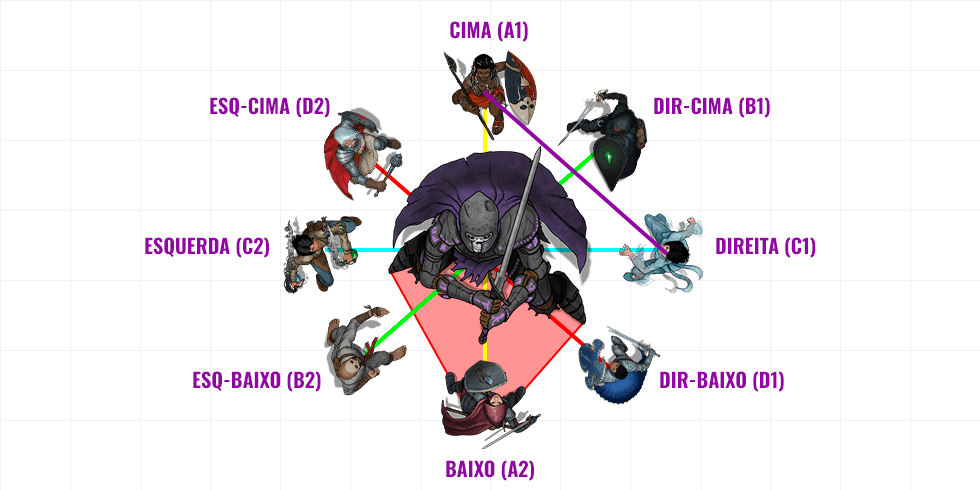 Temos 8 personagens (A1,B1,C1,D1,D2…) e 1 adversário (x). A1 deve estar em posição oposta com A2 para contar como 1 Posição. No entanto, A1 e C1 ou A1 e C2 não aplicam esta posição, pois a “linha” não passa por (x).